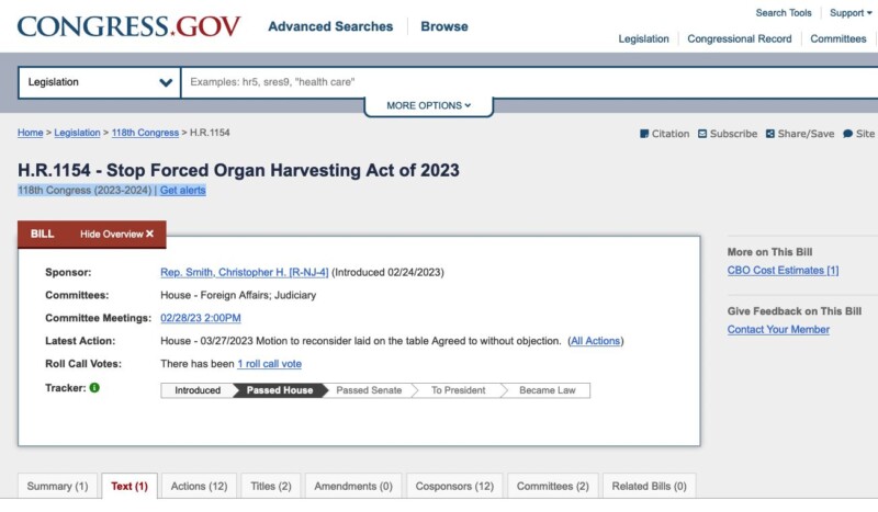 АКШ Конгрессинин Өкүлдөр Палатасы 2023-жылдын 27-мартында Кытайда мамлекет тарабынан уруксат берилген органды мажбурлап алууга каршы( 413 добуш каршы 2) добуш менен эки тараптуу партия мыйзам долбоорун кабыл алды. 2023-жылдагы Органды мажбурлап чогултууну токтотуу актысы (H.R. 1154 катары белгилүү), — бул кылмыш үчүн Кытайдын компартиясын жоопкерчиликке тартуу үчүн эки партиялуу көпчүлүк менен кабыл алынган биринчи мыйзам долбоору.
