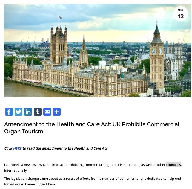 Саламаттыкты сактоо жана социалдык кам көрүү жөнүндө мыйзам долбоору 2022-жылдын апрелинин аягында Улуу Британиянын парламентинин актысы болуп калды. Моралдык коркунучтардан улам ал британ жарандарына трансплантация үчүн органдарды сатып алуу үчүн Кытайга же башка өлкөлөргө барууга тыюу салды. Бул мыйзам ошондой эле кылмышкер катары карала турган орган сатуу менен алектенген Улуу Британиянын жарандарына да тиешелүү.
